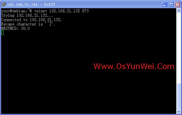 telnet 192.168.21.132 873 #输入命令后回车,如下图所示,表示通信成功
