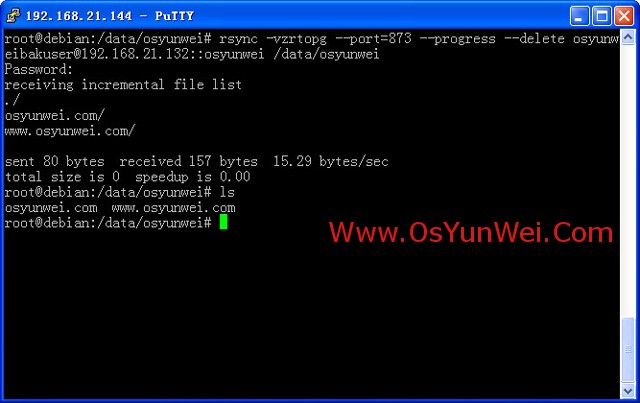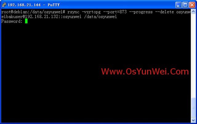 rsync -vzrtopg --port=873 --progress --delete osyunweibakuser@192.168.21.132::osyunwei /data/osyunwei
