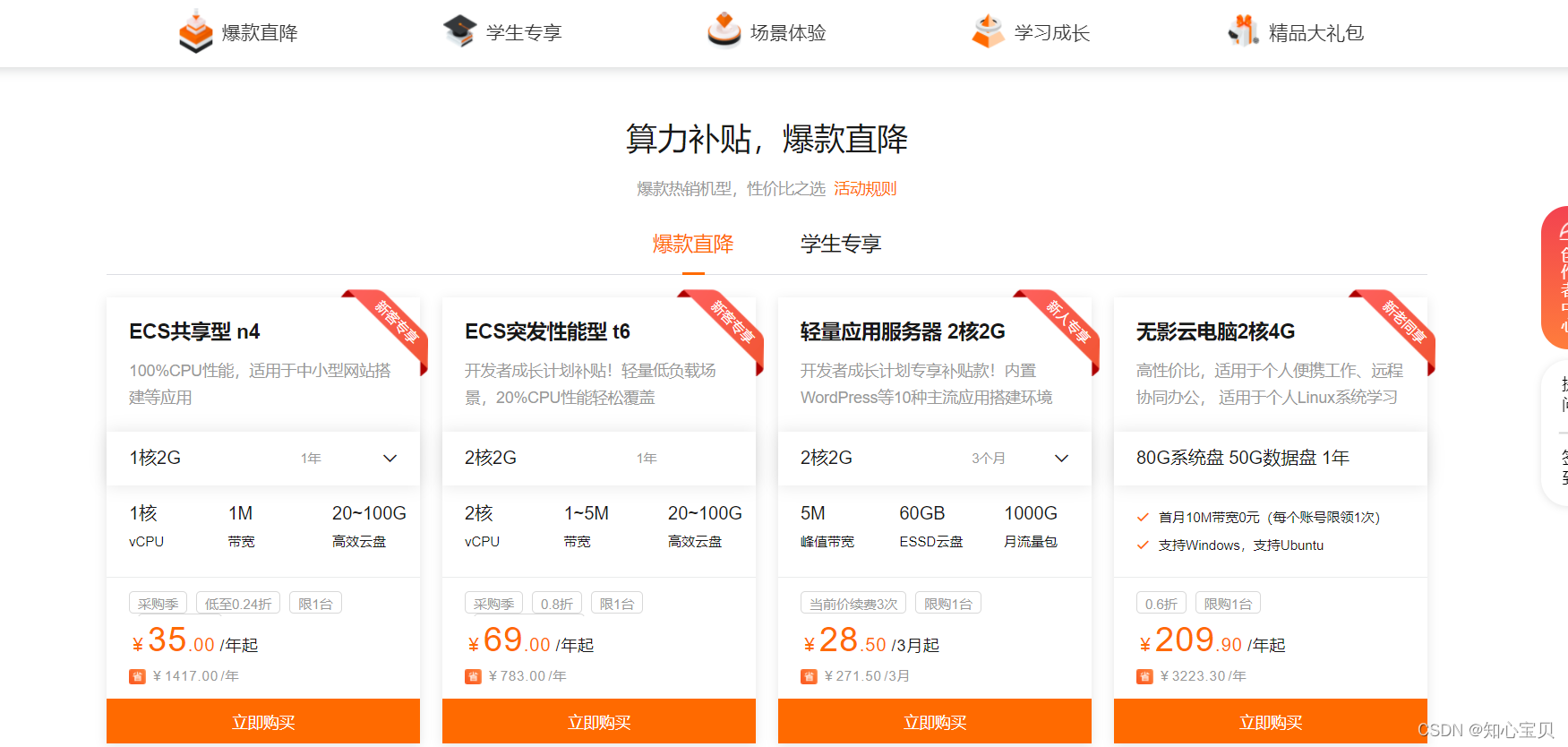 开发者成长计划免费体验云服务器的使用。在初步了解之后,原价上千的服务器只要35,当时我凭借学生身份60元买了一个轻量应用服务器,后续99元可以延期3年,十分划算。