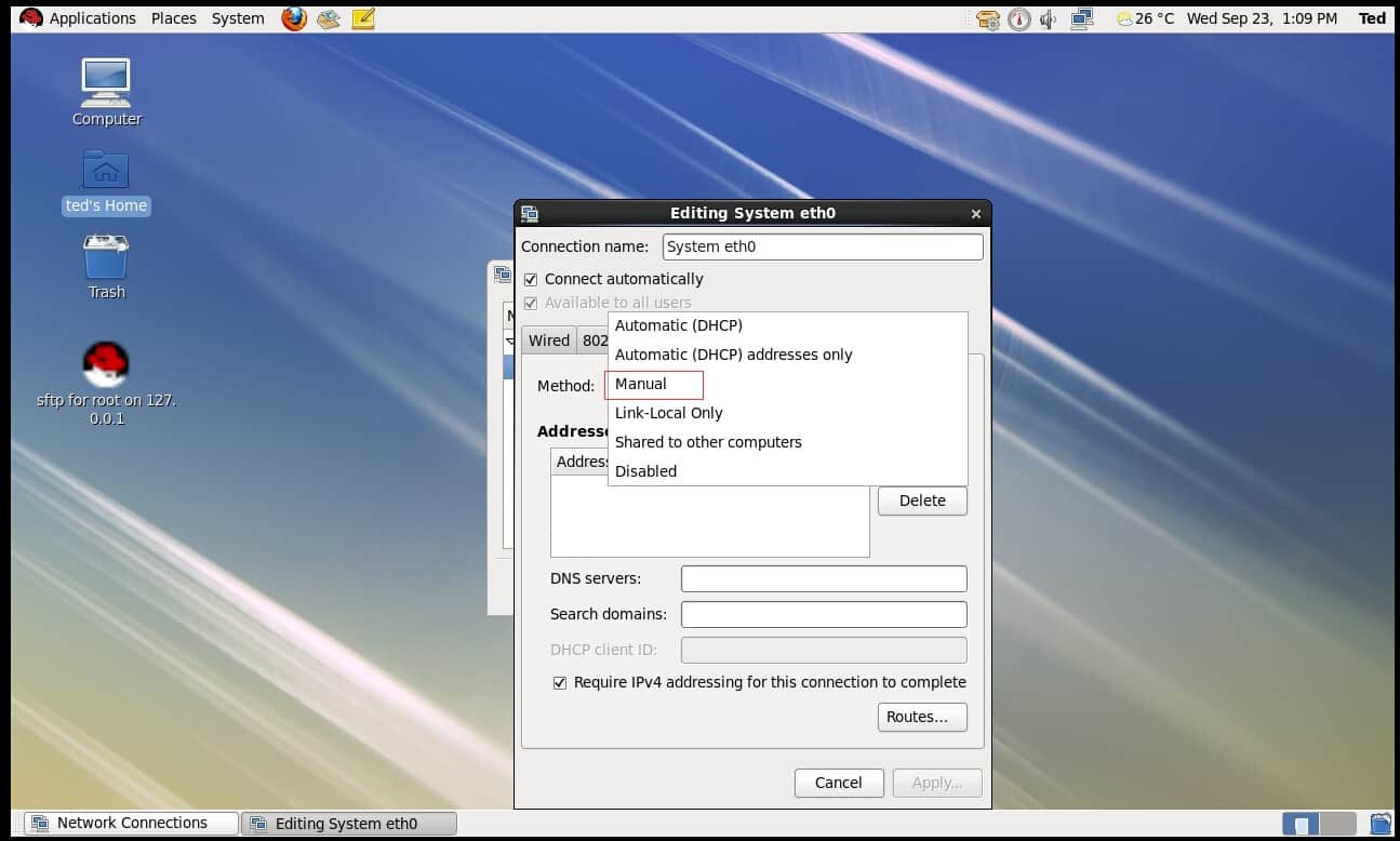 - 默认的网络连接方式为DHCP,现将其改为手动Manual(需要先了解整个网络段及网关,如图4)